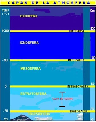 Se extiende a partir de la tropoausa, desde los 10 km en los polos y desde los 20 km en el ecuador hasta un límite superior, la estratopausa, ubicado a 50 km de la Tierra, aproximadamente. En esta capa no existen nubes, los vientos son muy fuertes y la temperatura aumenta de -60º C hasta -10º C al llegar a la zona más alta. En la estratopausa la temperatura es cercana a los 0º C. El oxígeno es muy escaso y no existe dióxido de carbono ni vapor de agua. A esa altura las radiaciones solares actúan sobre las moléculas de oxígeno y forman gas ozono (O3), que se acumula dando lugar a una capa ubicada entre 15 y 40 kilómetros de la Tierra. El ozono es un compuesto inestable de tres átomos de oxígeno que actúa como un potente filtro. La capa de ozono protege la vida de animales y vegetales absorbiendo los rayos ultravioleta. Si desapareciera, la luz ultravioleta del sol esterilizaría la superficie del planeta y aniquilaría toda la vida de los organismos. El ozono es el responsable de que ascienda la temperatura en la estratosfera.